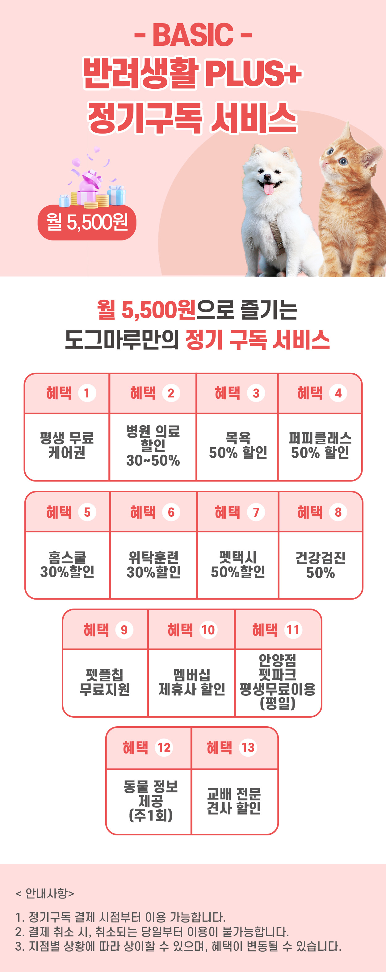 평생 무료 케어권 / 평생 의료 할인 30~50% / 목욕 50% 핳인 / 퍼피클래스 50% 할인 / 홈스쿨 30% 할인 / 위탁훈련 30% 할인 / 펫택시 50% 할인 / 건강검진 50% 할인 / 펫플칩 무료지원 / 멤버십 제휴사 할인 / 안양점 펫파크 평생무료이용(평일) / 동물정보 제공 (주1회) / 교배 전문 견사 할인